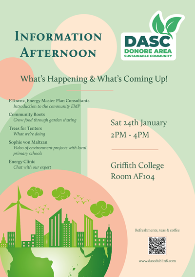 You are very welcome to join the Donore Area Sustainable Community (DASC) Afternoon Information Session taking place on Saturday 24th January from 2:00pm to 4:00pm in Griffith College, South Circular Road (Room AF 104).